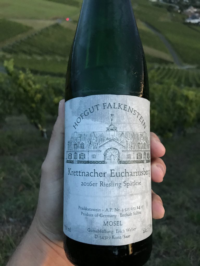 Am Besten gefallen hat mir eine restsüsse Spätlese aus einer der Top Lagen, dem Krettnacher Euchariusberg.